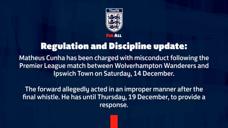 英足總在公告中寫道:“馬修斯-庫尼亞被指控在12月14日星期六狼隊對陣伊普斯維奇的英超比賽后行為不當。