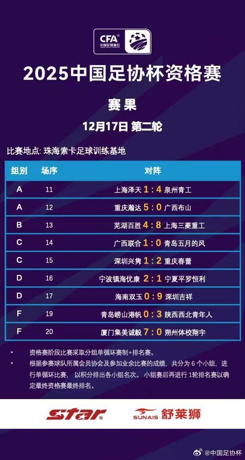 12月17日訊 今天進(jìn)行了足協(xié)杯資格賽第二輪的比賽,其中深圳吉祥9-0狂勝海南雙玉,上海三菱重工8-4大勝蕪湖百勝,廈門集美誠毅7-0大勝朔州體校翔宇。