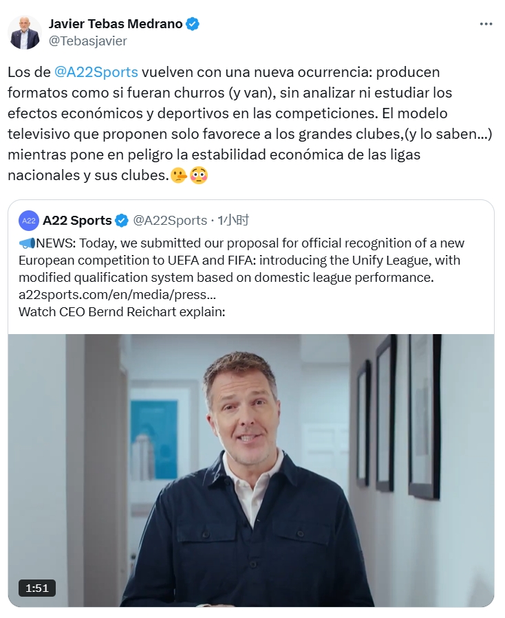 特巴斯轉(zhuǎn)發(fā)了一條歐超聯(lián)賽推廣公司A22的推廣文案,并配文評(píng)論道:“A22團(tuán)隊(duì)又帶著新點(diǎn)子回來(lái)了,他們像做油條一樣定制賽制,而不去分析和研究對(duì)比賽可能造成的經(jīng)濟(jì)和體育影響。他們提出的電視轉(zhuǎn)播模式只有利于大俱樂(lè)部(這點(diǎn)他們清楚),同時(shí)危及各國(guó)聯(lián)賽以及其他俱樂(lè)部的經(jīng)濟(jì)穩(wěn)定。”