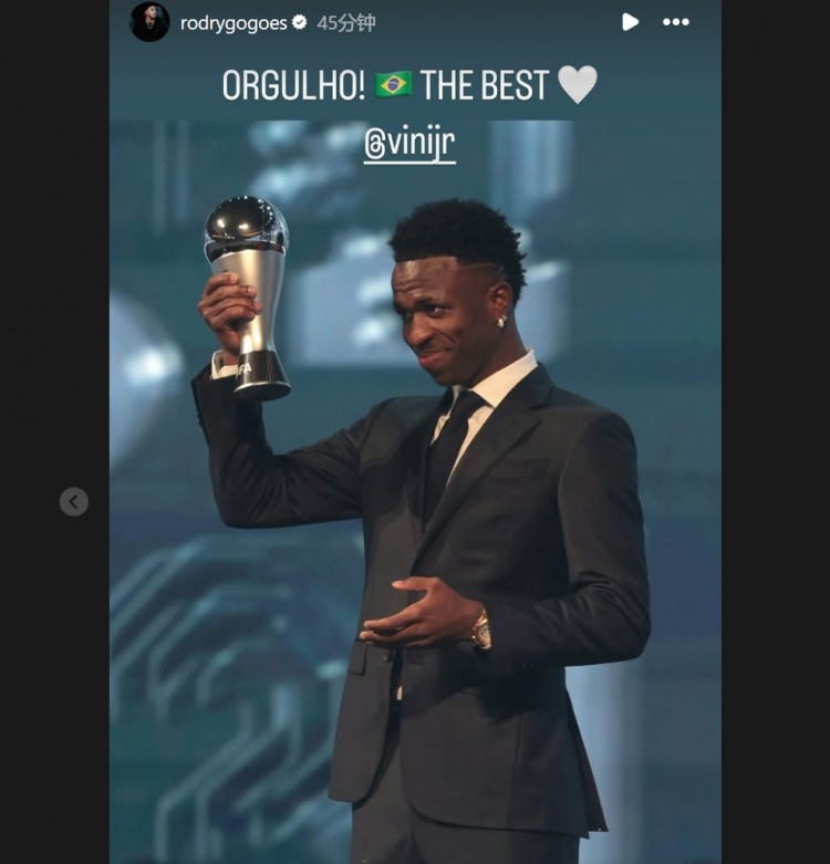 羅德里戈曬出了維尼修斯手捧獎杯的照片,并艾特了對方官方賬號:“自豪![巴西國旗]最佳球員!”