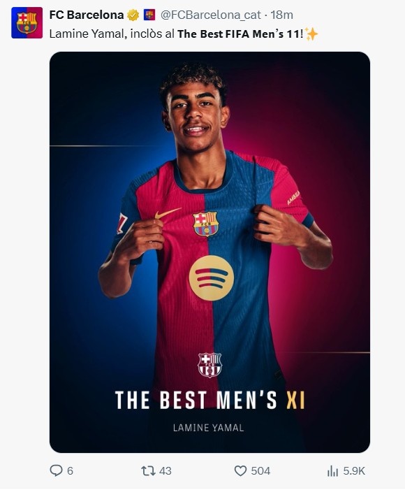 巴薩女足球員6人入圍年度最佳陣容,邦馬蒂獲得女足最佳球員,亞馬爾入圍年度最佳陣容。