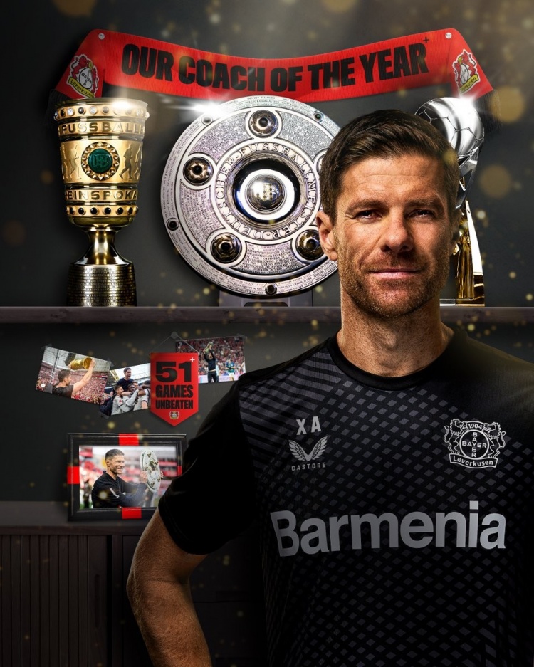 勒沃庫森官推則曬出海報(bào)致敬自家主帥,3座冠軍獎杯(德甲、德國杯和德超杯)在列,51場連續(xù)不敗也赫然在目。