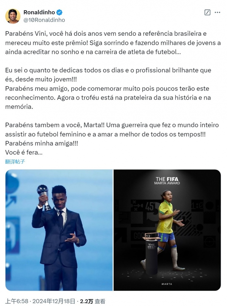 12月18日訊 巴西前鋒維尼修斯當(dāng)選FIFA年度最佳球員,羅納爾迪尼奧社媒發(fā)文表示祝賀。