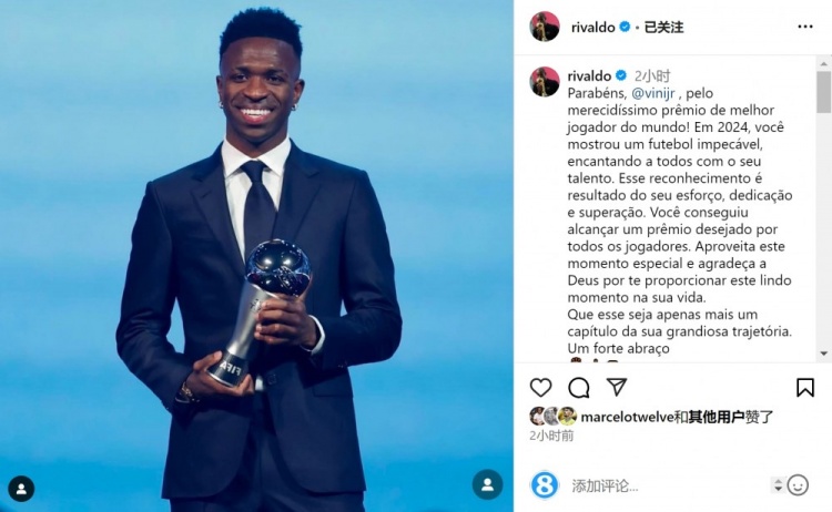 12月18日訊 維尼修斯當選FIFA年度最佳球員,巴西足壇名宿里瓦爾多社媒發(fā)文祝賀。