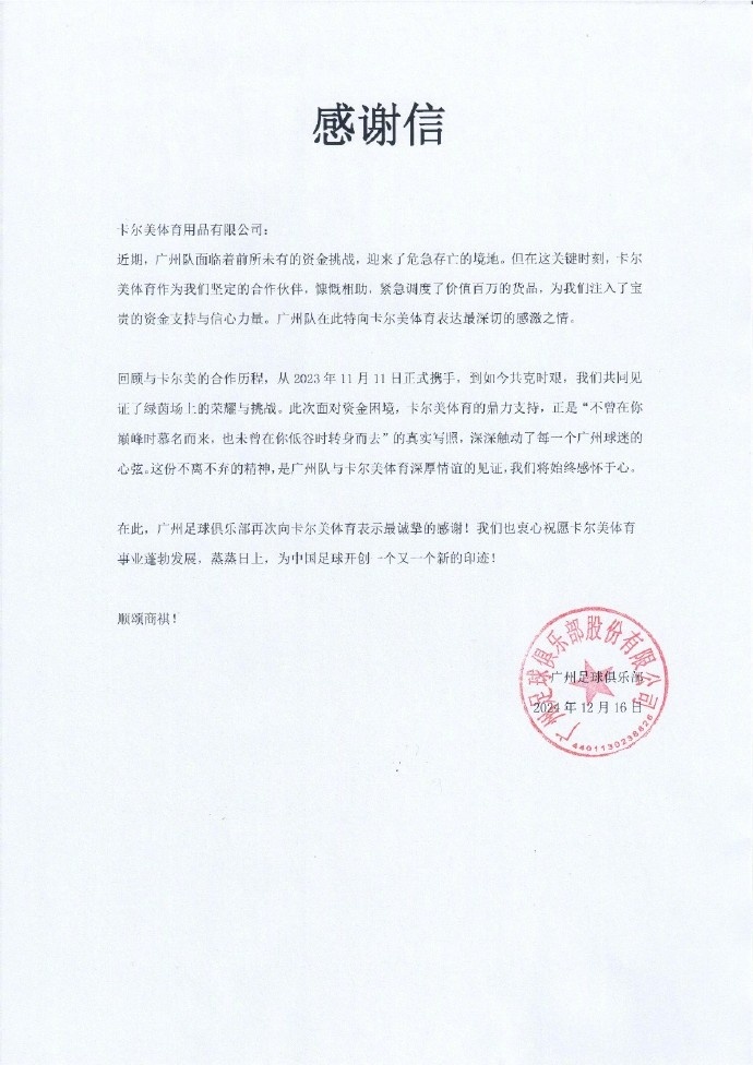 對(duì)此,廣州足球俱樂(lè)部官方也向該贊助商發(fā)去感謝信,感謝了對(duì)方在危急存亡時(shí)刻的力挺。