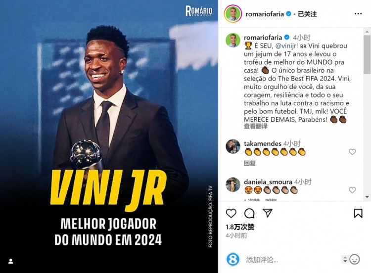 12月18日訊 維尼修斯當(dāng)選FIFA2024年度最佳球員,巴西足壇名宿羅馬里奧社媒發(fā)文表示祝賀。