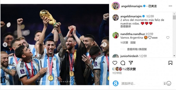 12月18日訊 迪馬利亞更新社媒動態(tài),紀(jì)念阿根廷隊贏得卡塔爾世界杯冠軍兩周年。