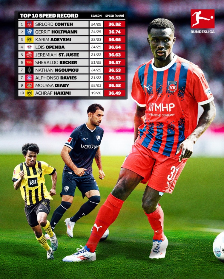 12月18日訊 德甲官方曬出了賽事歷史最快速度榜單,海登海姆前鋒康特36.82km/h居首,阿德耶米第3,戴維斯第7,阿什拉夫第10。