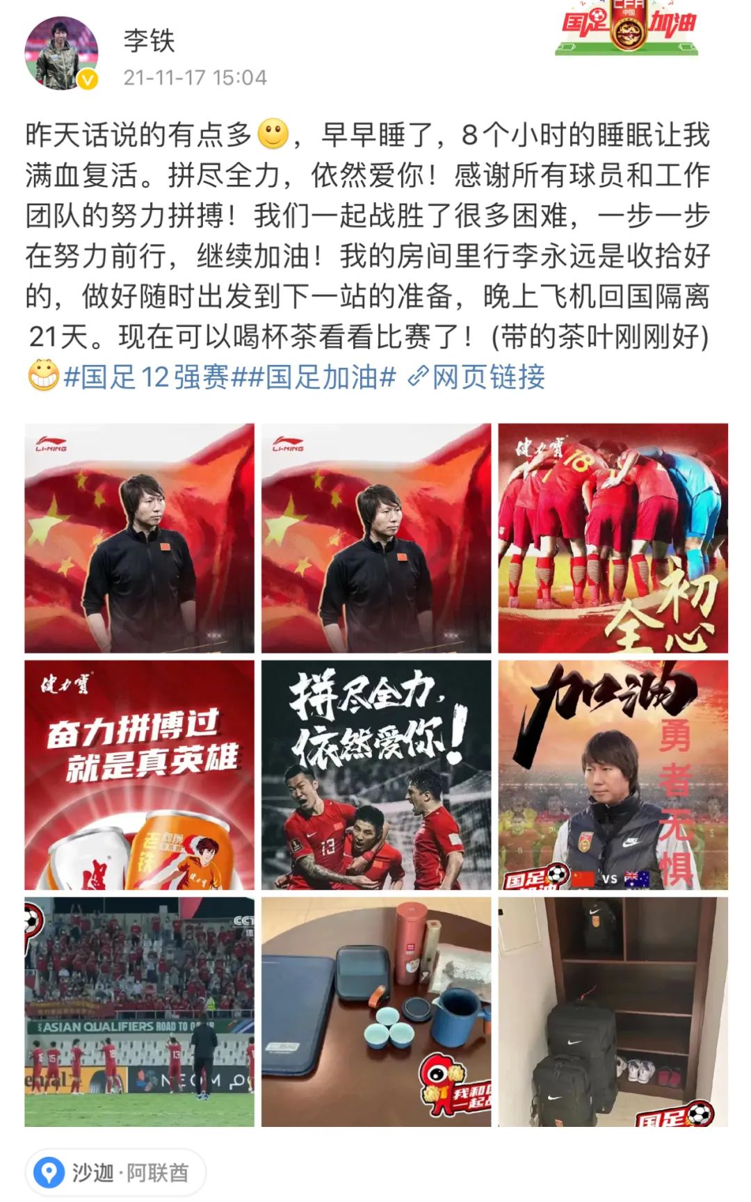 據(jù)不完全統(tǒng)計,李鐵任國足主帥期間共發(fā)布近30條宣傳微博,涉及健力寶、李寧、茶葉等個人代言,把微博變成了大型廣告植入現(xiàn)場。整個12強(qiáng)賽期間,他一直沒有停止“帶貨”。一位足協(xié)內(nèi)部人士透露,實際上在12強(qiáng)賽進(jìn)行期間,國家隊方面就曾多次向李鐵強(qiáng)調(diào)注意言行,李鐵的回答都是“知道了”,但收效甚微。