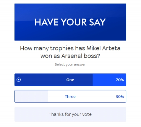 英國媒體天空體育也發(fā)起了投票,據(jù)目前數(shù)據(jù)顯示,有70%的投票者選擇了阿爾特塔只拿了一座冠軍,選擇三座冠軍的只有三成的投票者。
