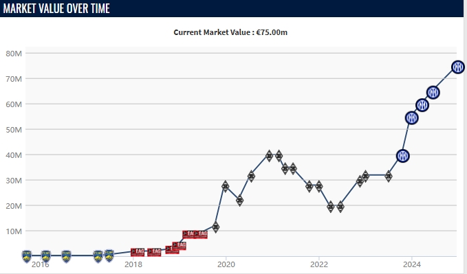 小圖拉姆剛加盟國米時(shí),身價(jià)僅為3200萬歐,在國米的一年半時(shí)間里,他的身價(jià)一路走高并最終翻倍,達(dá)到目前的7500萬歐。