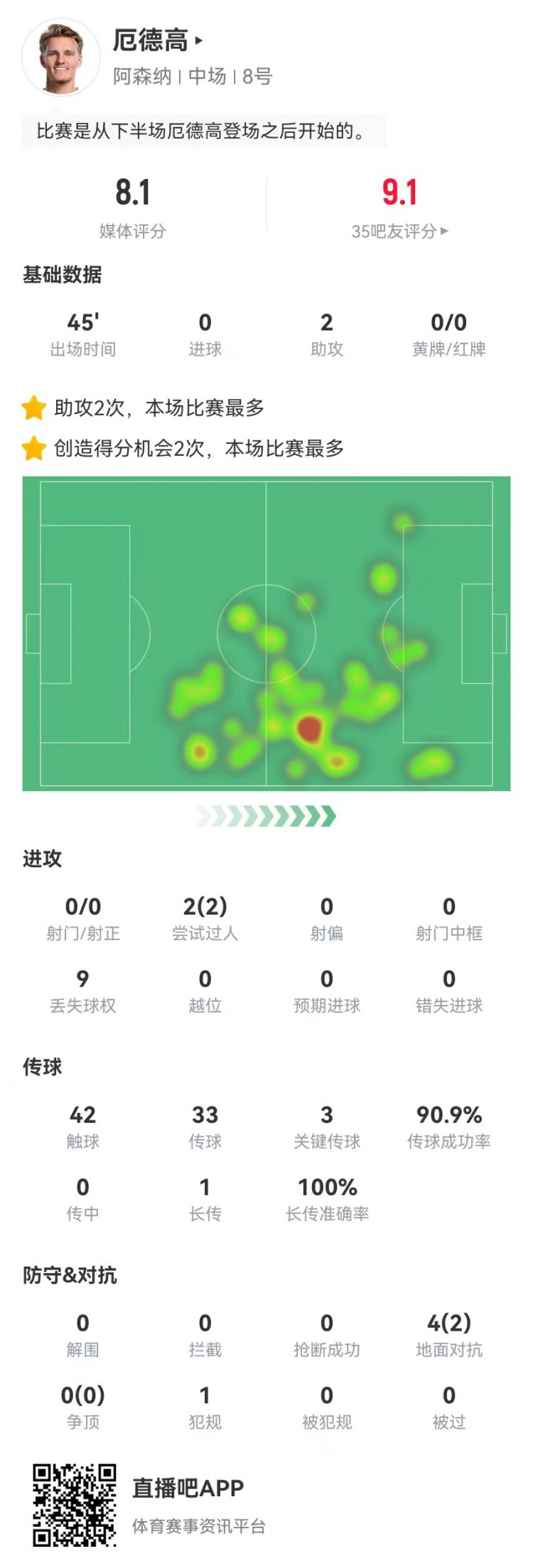 12月19日訊 阿森納在本輪聯(lián)賽杯3-2力克水晶宮,厄德高本場(chǎng)數(shù)據(jù)如下: