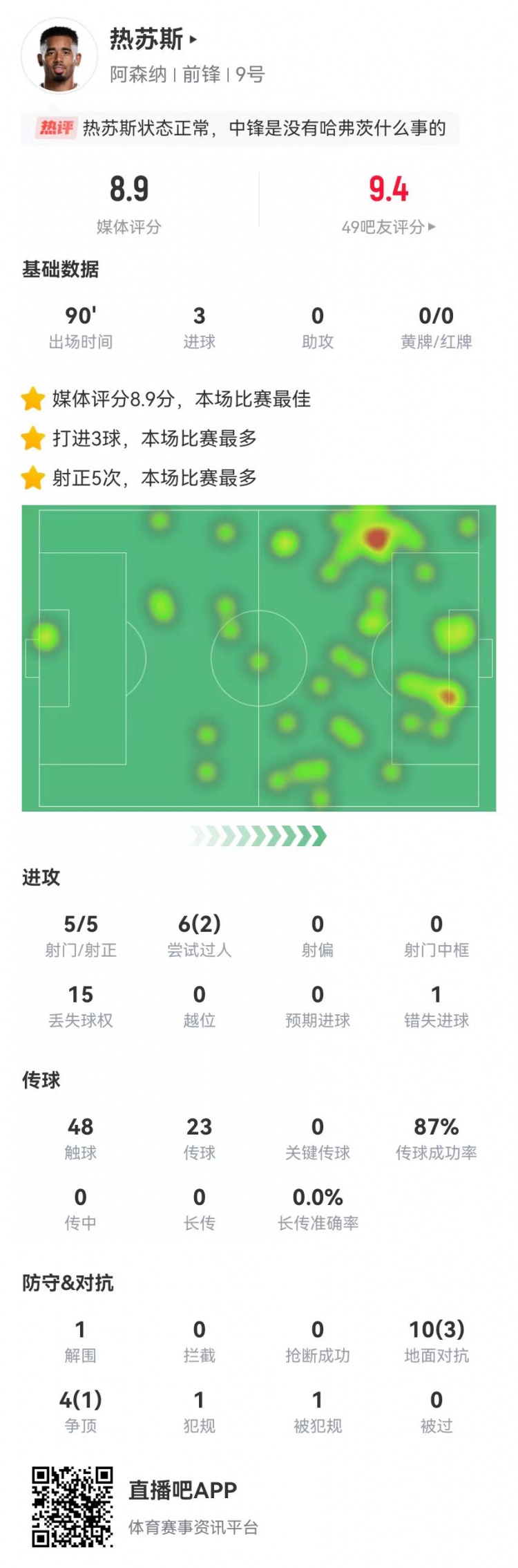12月19日訊 阿森納在本輪聯(lián)賽杯3-2力克水晶宮,熱蘇斯本場數(shù)據(jù)如下: