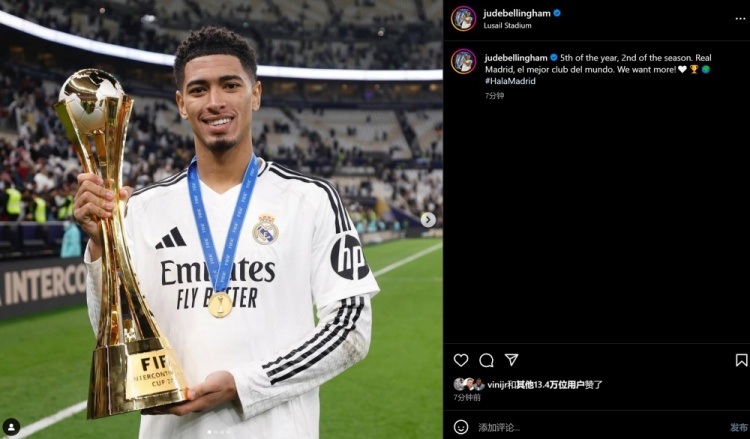 貝林曬出自己捧杯時(shí)的照片,并配文:今年的第5冠,本賽季第2冠!皇馬是世界上最好的俱樂部,我們還想要更多!