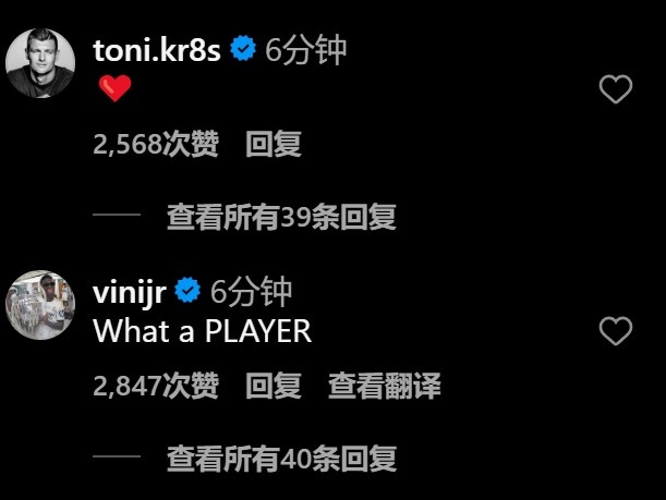在評(píng)論區(qū),克羅斯和維尼修斯也稱贊了貝林厄姆。