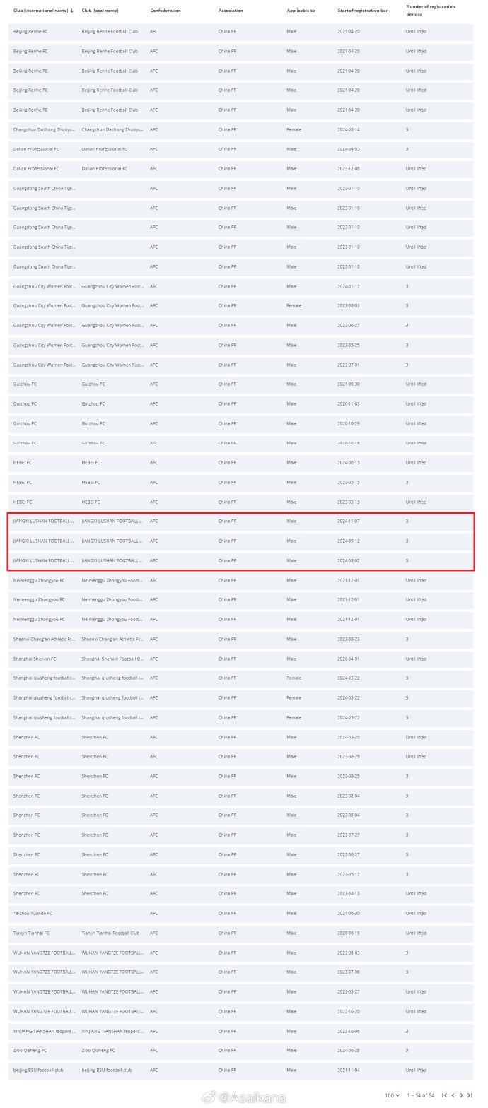 北京時間12月19日凌晨更新的國際足聯(lián)注冊禁令披露系統(tǒng),武漢三鎮(zhèn)轉(zhuǎn)會禁令清零。目前還存在轉(zhuǎn)會注冊禁令僅剩江西廬山(3條)一家。