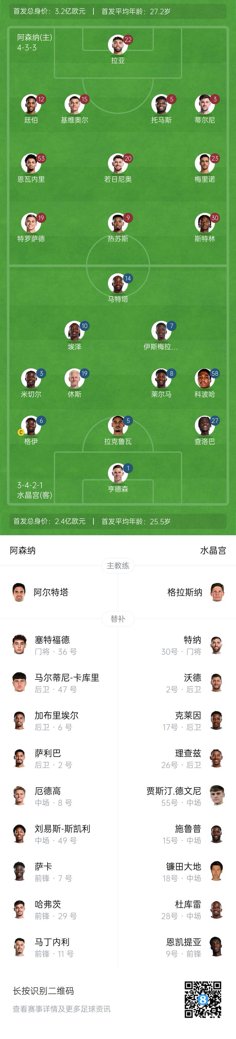 阿森納首發(fā):22-拉亞、5-托馬斯、12-廷伯、15-基維奧爾、3-蒂爾尼、20-若日尼奧、23-梅里諾、53-恩瓦內(nèi)里、30-斯特林、19-特羅薩德、9-熱蘇斯
