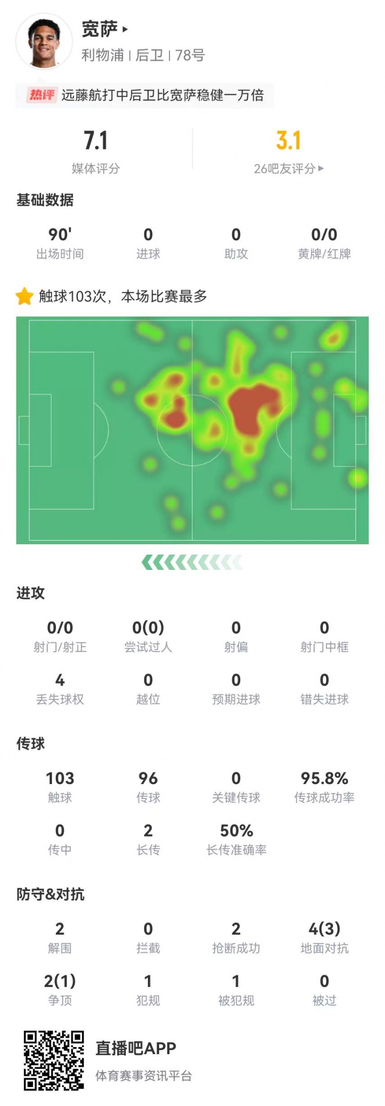 發(fā)布時間:2024年12月19日 08:03點擊:欄目:足球新聞 12月19日訊 利物浦在本輪聯賽杯2-1客勝南安普頓,最后時刻險些送點的寬薩本場數據如下:出場90分鐘2解圍1封堵2搶斷0被過6對抗、4成功4丟失球權1犯規(guī)1造犯規(guī)103觸球96傳球、92成功,成功率96%2長傳、1成功獲評7.1分 除特別注明外,本站所有內容均為24直播網整理排版,轉載請注明出處:數據很穩(wěn)球迷很慌寬薩2解圍2搶斷 6對抗4成功+傳球成功率96% 本文標簽: 足球 英超 利物浦 南安普頓