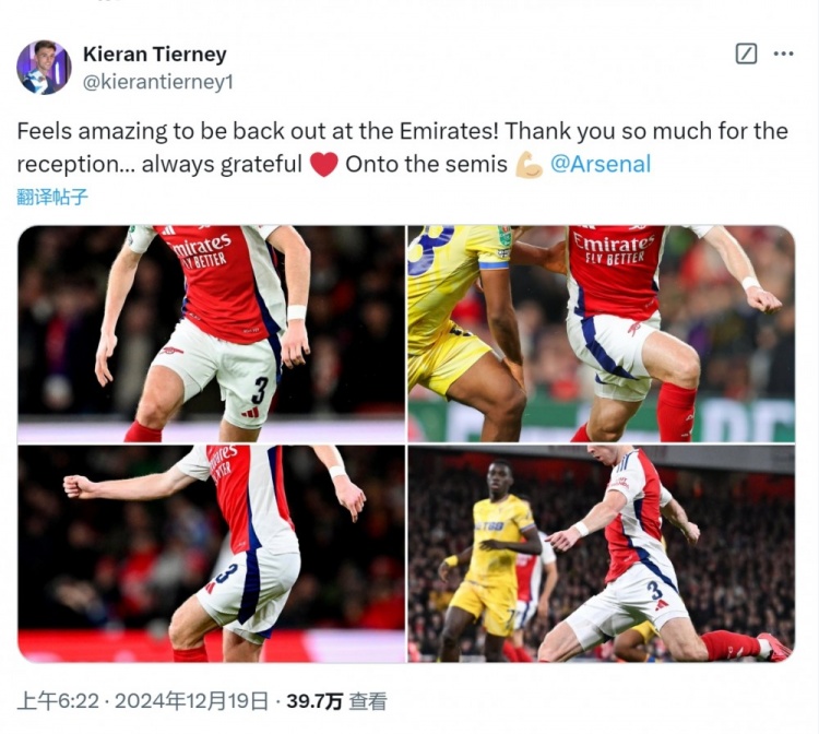 蒂爾尼此前因傷長期缺席,這是他本賽季首次出場,賽后蒂爾尼在社交媒體上曬出自己的比賽照片,配文:“回到酋長球場感覺很棒,非常感謝大家的歡迎。永遠心存感激,晉級半決賽!”