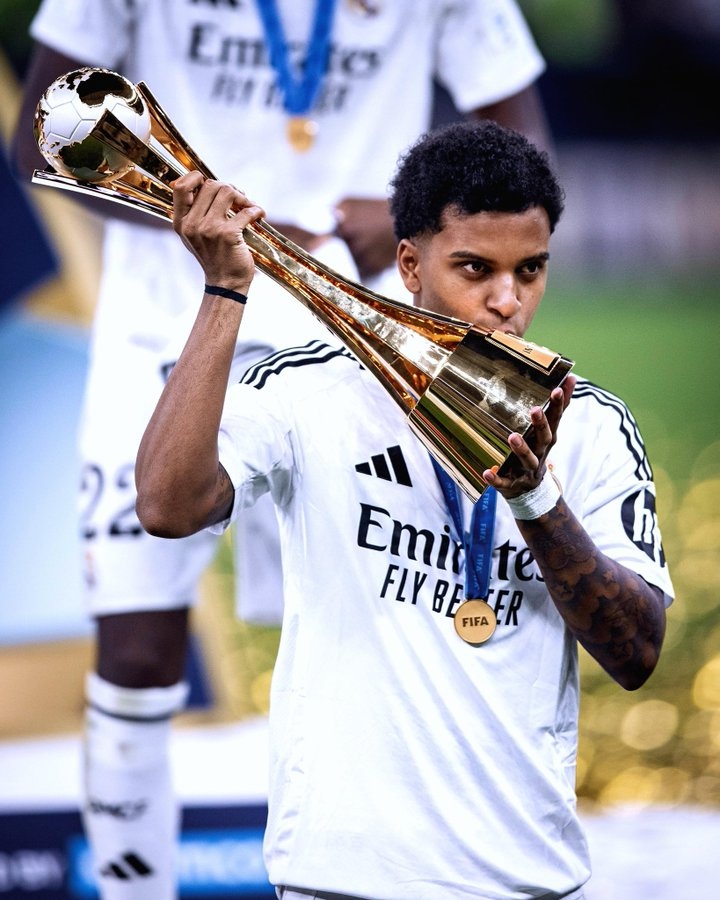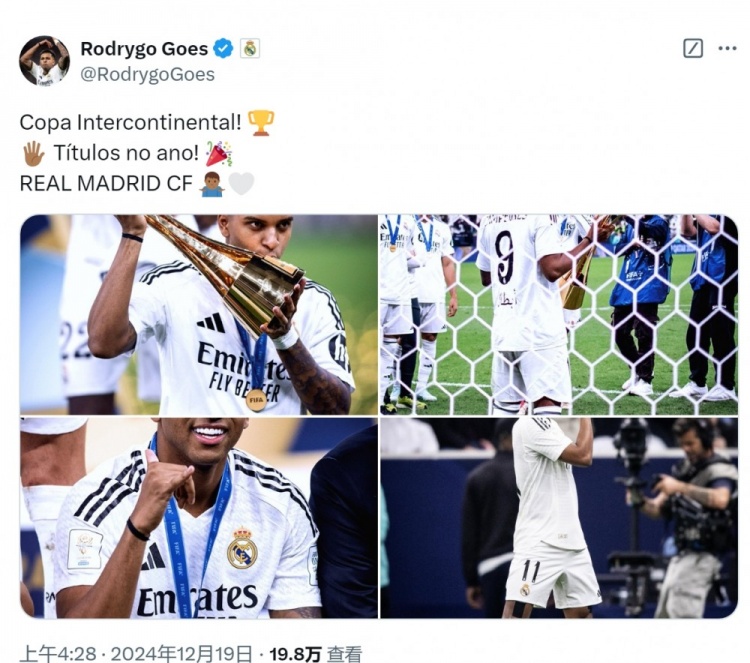 羅德里戈賽后在社交媒體上曬出親吻獎杯的照片,并寫道:“洲際杯冠軍!今年第5座冠軍獎杯!皇馬!”
