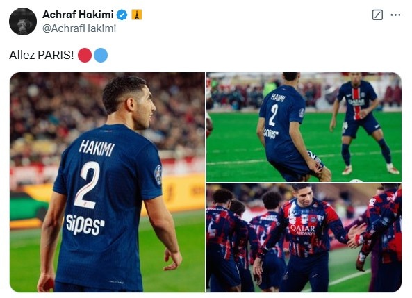 賽后,巴黎后衛(wèi)阿什拉夫在社交媒體曬圖,慶祝球隊獲勝。他還配文寫道:“加油,巴黎!”