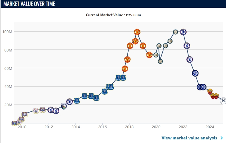 盧卡庫在25歲以及28歲時身價都達到過1億歐。
