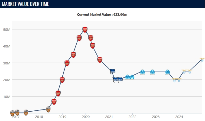 年少時(shí)的貢多齊在阿森納成名,2019年的時(shí)候20歲的他身價(jià)一度高達(dá)5000萬(wàn)歐。貢多齊離開(kāi)阿森納之后去到了法甲馬賽,但是表現(xiàn)平平。直到上賽季租借拉齊奧,他逐漸找回自我,并在藍(lán)鷹坐穩(wěn)主力。本賽季貢多齊1300萬(wàn)歐正式加盟藍(lán)鷹,在意甲的這一年半,他的身價(jià)一共漲了1200萬(wàn)。