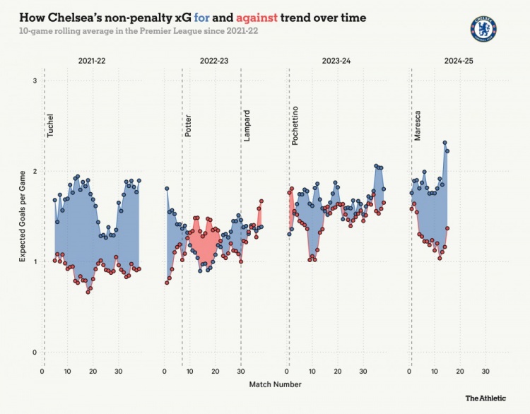 在圖赫爾的帶領(lǐng)下,切爾西曾在21/22賽季殺入英超前四。那個賽季切爾西贏得了超級杯和世俱杯的冠軍,還殺入了足總杯和聯(lián)賽杯決賽(兩次都是在點球大戰(zhàn)中輸給了利物浦)。那支圖赫爾的切爾西,算得上是一支優(yōu)秀的球隊,而從下圖你會發(fā)現(xiàn),馬雷斯卡的球隊是圖赫爾之后最強的。