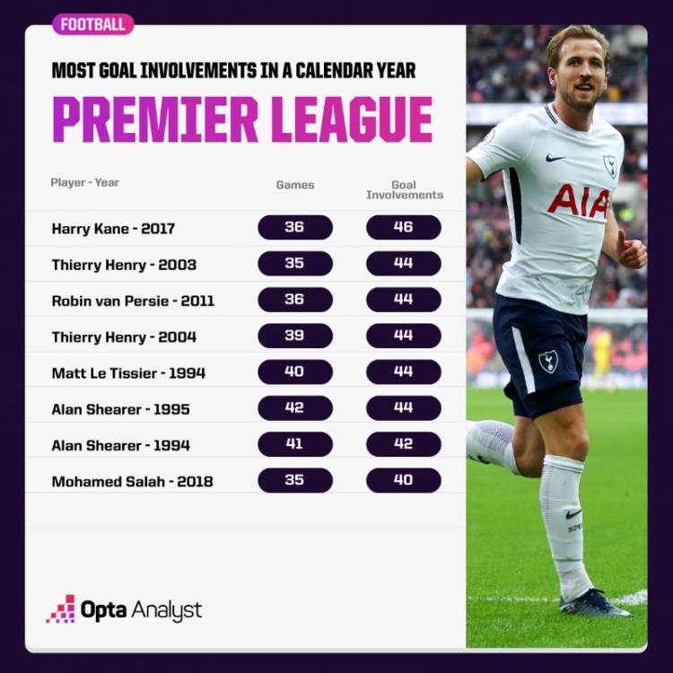 12月19日訊 Opta統(tǒng)計了球員在英超參與進球的數(shù)量,并列出英超自然年參與進球榜,2017年凱恩參與46球居首。