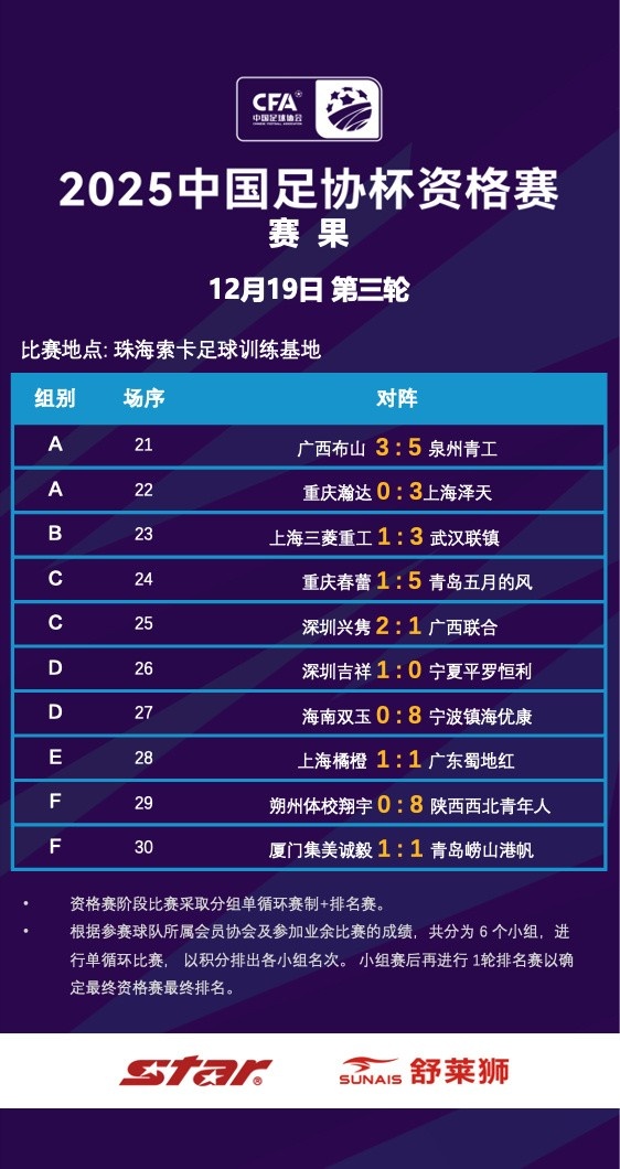 12月19日訊 今天進(jìn)行了足協(xié)杯資格賽第三輪的比賽,其中武漢聯(lián)鎮(zhèn)3-1擊敗上海三菱重工,寧波鎮(zhèn)海優(yōu)康和陜西西北青年人均已8-0的比分大勝對手。