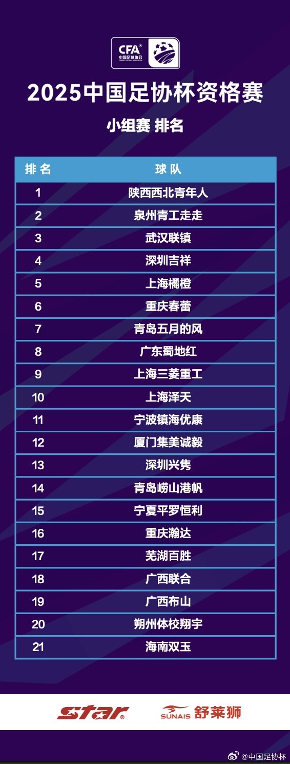 12月19日訊 足協(xié)杯資格賽前三輪過后,小組賽階段排名塵埃落定,目前陜西西北青年人、泉州青工走走、武漢聯(lián)鎮(zhèn)位居前三。