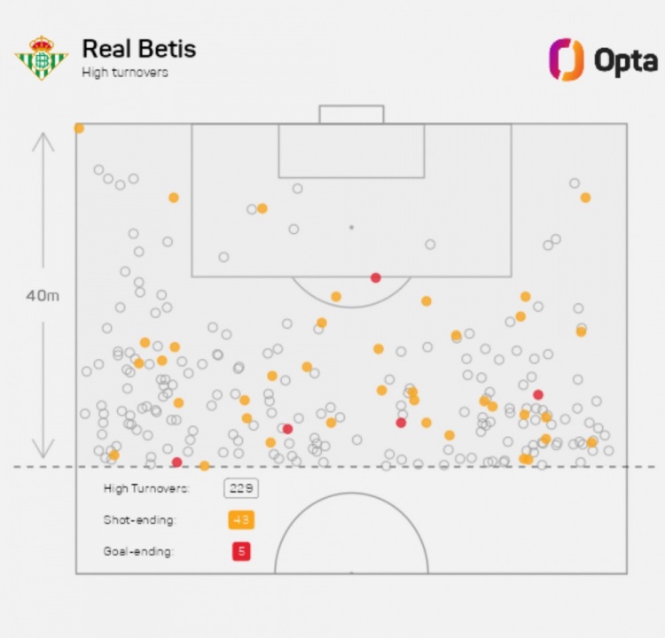 此外,在貝蒂斯發(fā)起的252次高位反擊中,最終有43次成功完成射門,并取得了5粒進球。