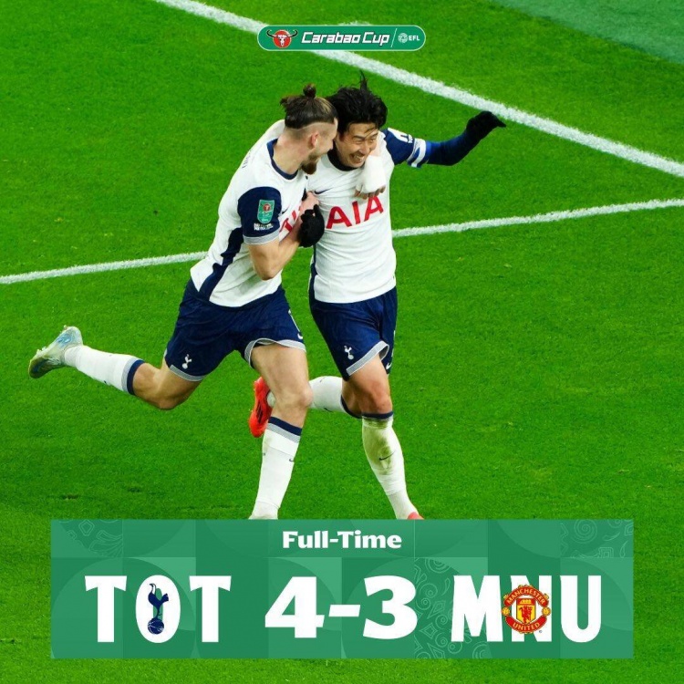 英聯(lián)杯1/4決賽,熱刺4-3曼聯(lián)晉級四強。上半場,索蘭克補射破門,林德洛夫傷退;下半場,庫盧建功,索蘭克再下一城,福斯特兩送禮,齊爾克澤和阿瑪?shù)缕崎T,尾聲階段孫興慜直接罰進角球,補時埃文斯頭球得手。