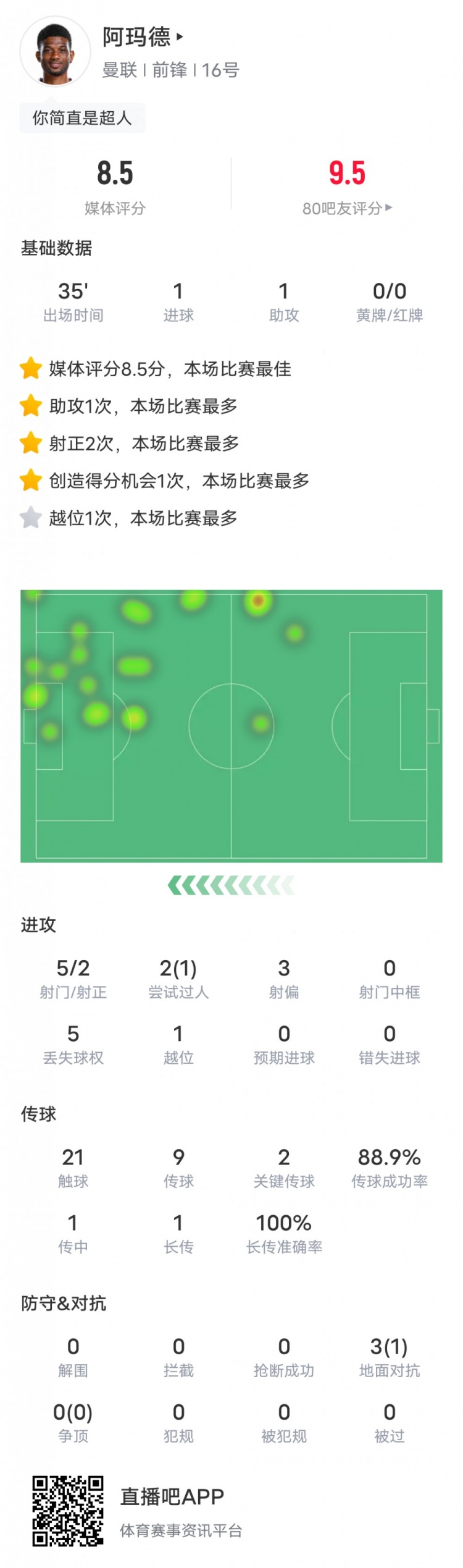 12月20日訊 英聯(lián)杯1/4決賽,曼聯(lián)3-4不敵熱刺。紅魔邊鋒阿瑪?shù)?迪亞洛本場(chǎng)替補(bǔ)出戰(zhàn),傳射建功,還送出2次關(guān)鍵傳球,評(píng)分8.5全場(chǎng)最高。