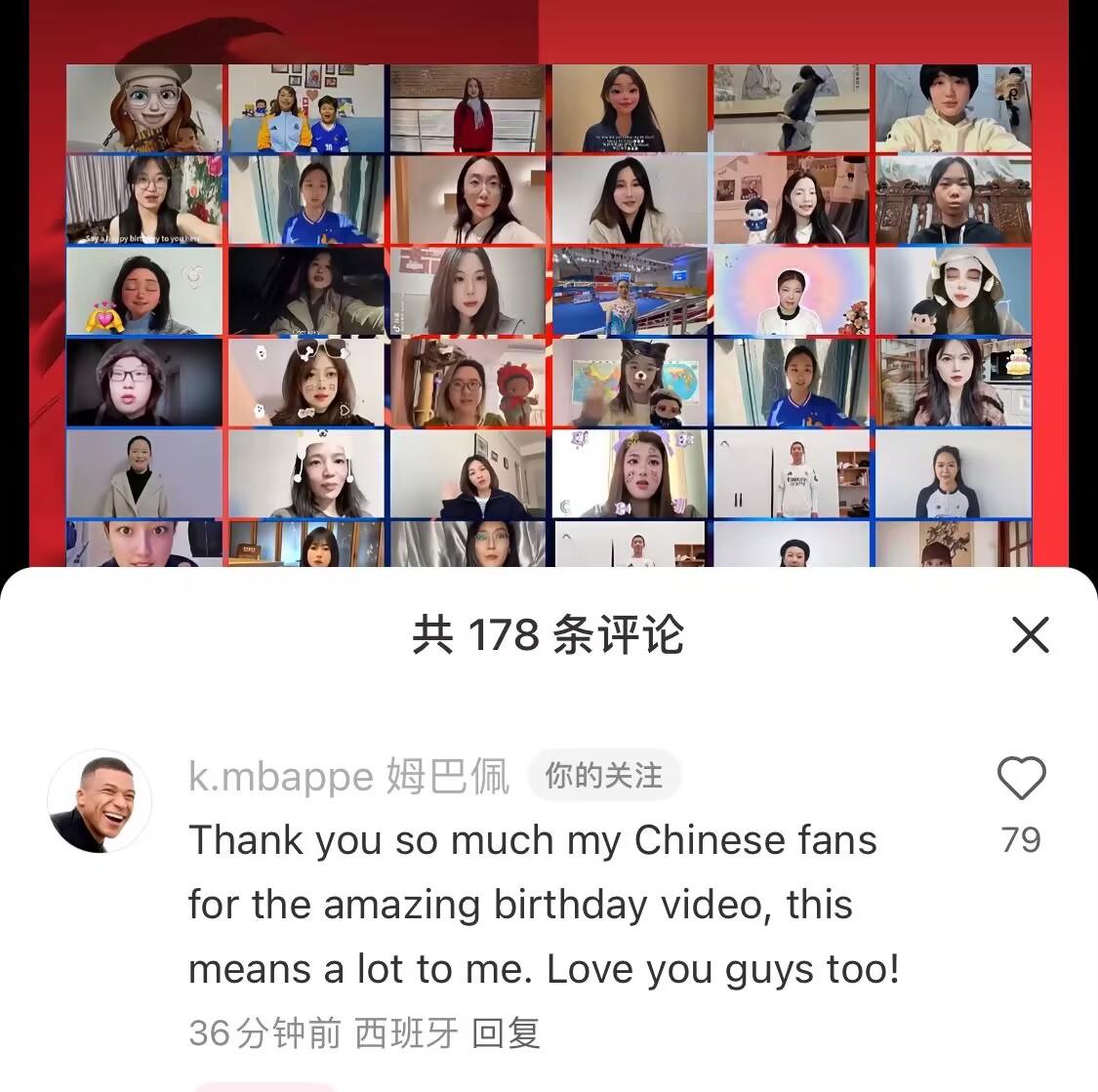 姆巴佩在評論區(qū)回復(fù):“非常感謝中國球迷制作如此動人的生日視頻,這對我意義非凡,愛你們”。