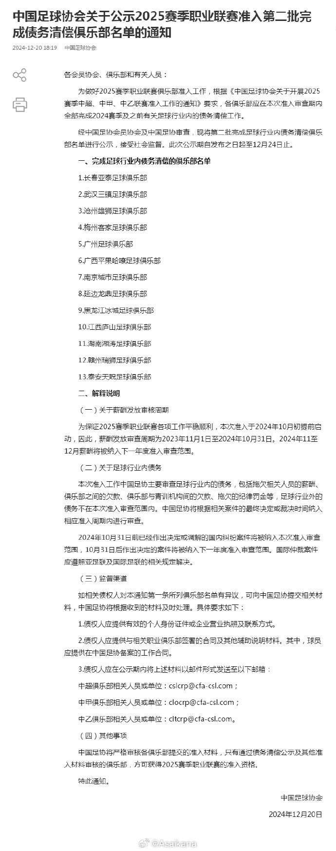 中國足協(xié)公示2025賽季職業(yè)聯(lián)賽準(zhǔn)入第二批完成債務(wù)清償俱樂部名單,此前不在第一批名單里的長春亞泰、武漢三鎮(zhèn)、滄州雄獅、梅州客家、廣州、廣西平果哈嘹、南京城市、延邊龍鼎、黑龍江冰城、江西廬山、湖南湘濤、贛州瑞獅、泰安天貺全員上榜,相當(dāng)于所有三級(jí)職業(yè)俱樂部都進(jìn)行了完成債務(wù)清償?shù)墓尽????