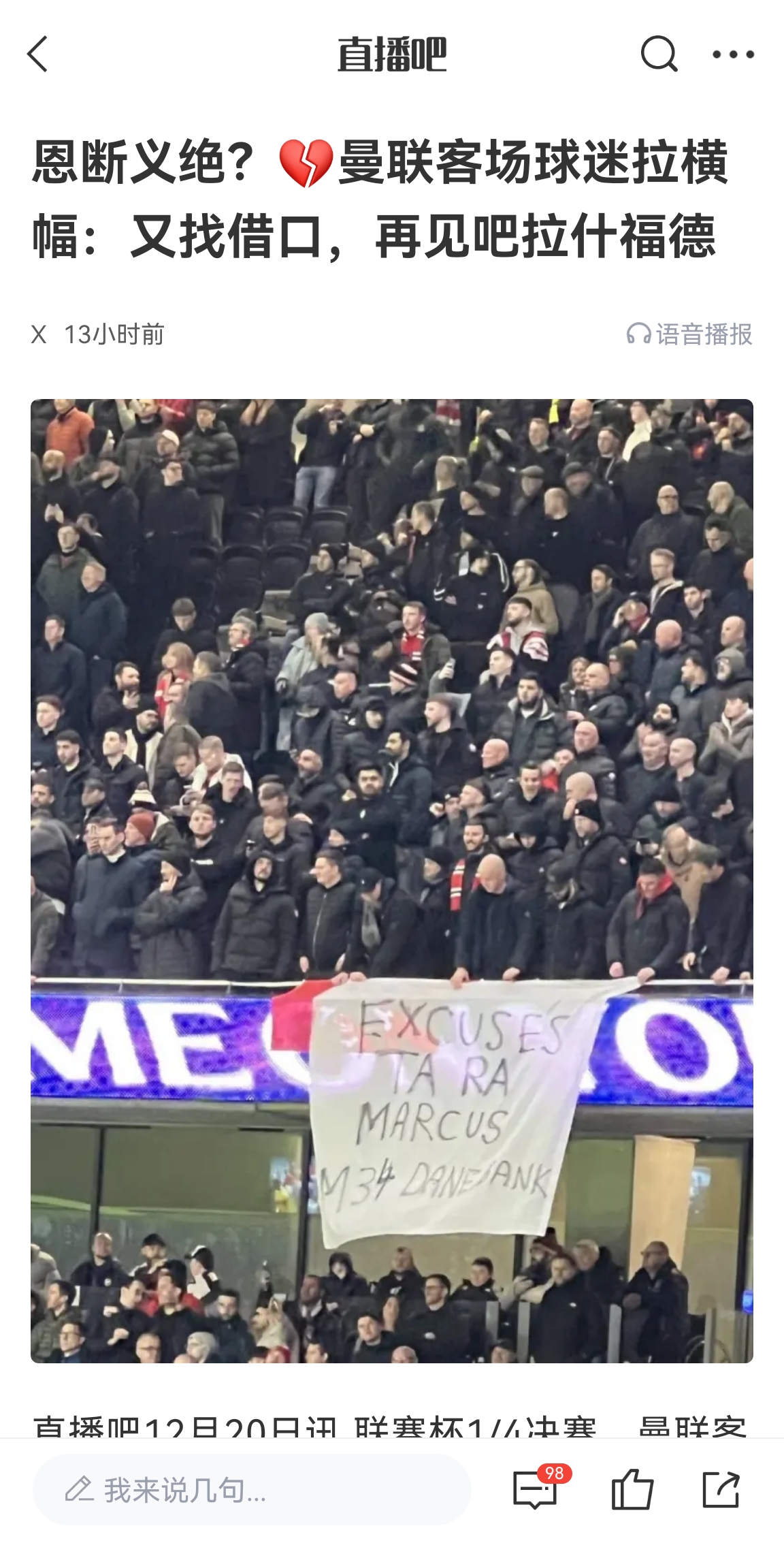 在曼聯(lián)3-4不敵熱刺的比賽中,拉什福德再度落選名單。賽后阿莫林表示,不會和拉什福德聊他的“新挑戰(zhàn)”言論,同時他也被問到了球迷的“反拉什福德橫幅”:球迷會幫助馬庫斯(拉什福德),因?yàn)榍蛎詯鬯6鴲酆秃奘怯悬c(diǎn)相近的,所以此時此刻我們必須理解球迷。我們會像對待所有球員一樣對待拉什福德,我專注于提高球隊(duì),而非某一球員。