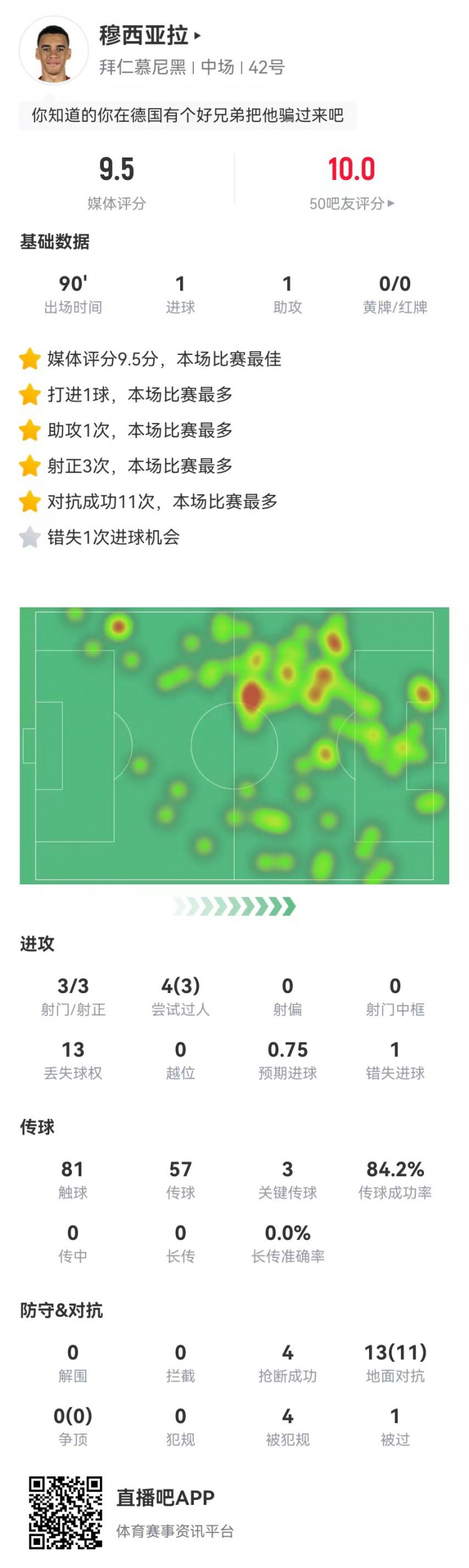 12月21日訊 拜仁在本輪德甲5-1大勝萊比錫,穆西亞拉本場(chǎng)數(shù)據(jù)如下: