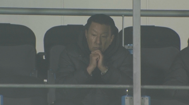 12月04日訊 泰山0-4慘敗川崎前鋒,賽后鏡頭給到看臺,因?yàn)橥Y愖鞅谏嫌^的崔康熙無助地看著場內(nèi)。