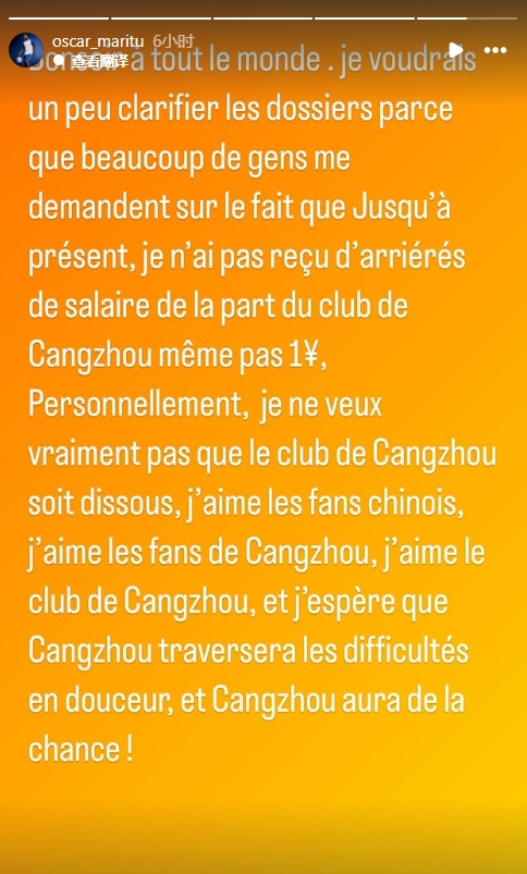 小奧斯卡寫道:澄清一下,因為那么多人詢問。目前,我還沒有收到任何來自俱樂部的欠款、薪資,連1塊錢也沒有。