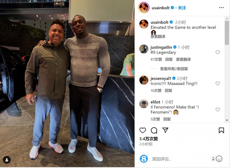 博爾特在社交媒體上曬出與羅納爾多的合照,配文:“將足球提升到另一個水平?!?/p>