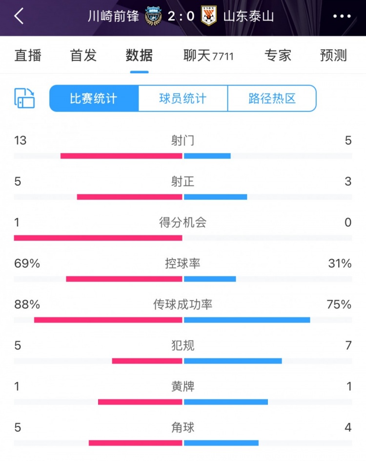 12月4日訊 亞冠精英聯(lián)賽第6輪比賽,客場作戰(zhàn)的山東泰山上半場0-2落后于川崎前鋒。半場數(shù)據(jù)上,泰山隊處于全面下風(fēng)。