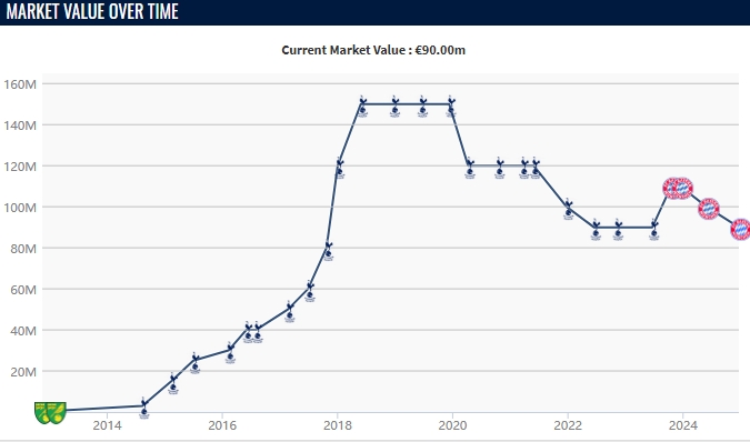12月21日訊 昨日德轉(zhuǎn)更新了德甲球員身價(jià),本賽季表現(xiàn)出色的凱恩身價(jià)卻被下調(diào)1000萬歐,目前身價(jià)9000萬歐跌出億元先生行列。