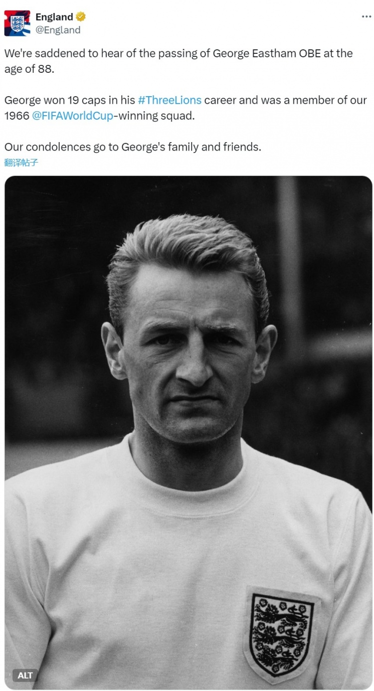 英格蘭隊(duì)官方社媒發(fā)文致哀:“我們沉痛地獲悉喬治-伊斯特姆逝世,享年88歲。 喬治三獅軍團(tuán)生涯出場(chǎng)19次,并且是我們1966年世界杯冠軍成員之一。我們向喬治的家人和朋友表示哀悼?!?/p>