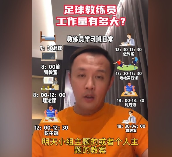“你要管理一個(gè)球隊(duì),你不能說(shuō)隊(duì)員到點(diǎn)睡覺(jué)了,你也到點(diǎn)睡覺(jué)了。而且講師當(dāng)時(shí)給我們舉過(guò)一個(gè)例子,他們學(xué)職業(yè)級(jí)教練,要求他們晚上這場(chǎng)比賽結(jié)束,把這個(gè)錄像導(dǎo)到能呈現(xiàn)出來(lái),差不多凌晨了,然后再剪出來(lái)。剪完了之后,洗把臉上課,一宿沒(méi)睡,工作量確實(shí)很大的?!?/p>
