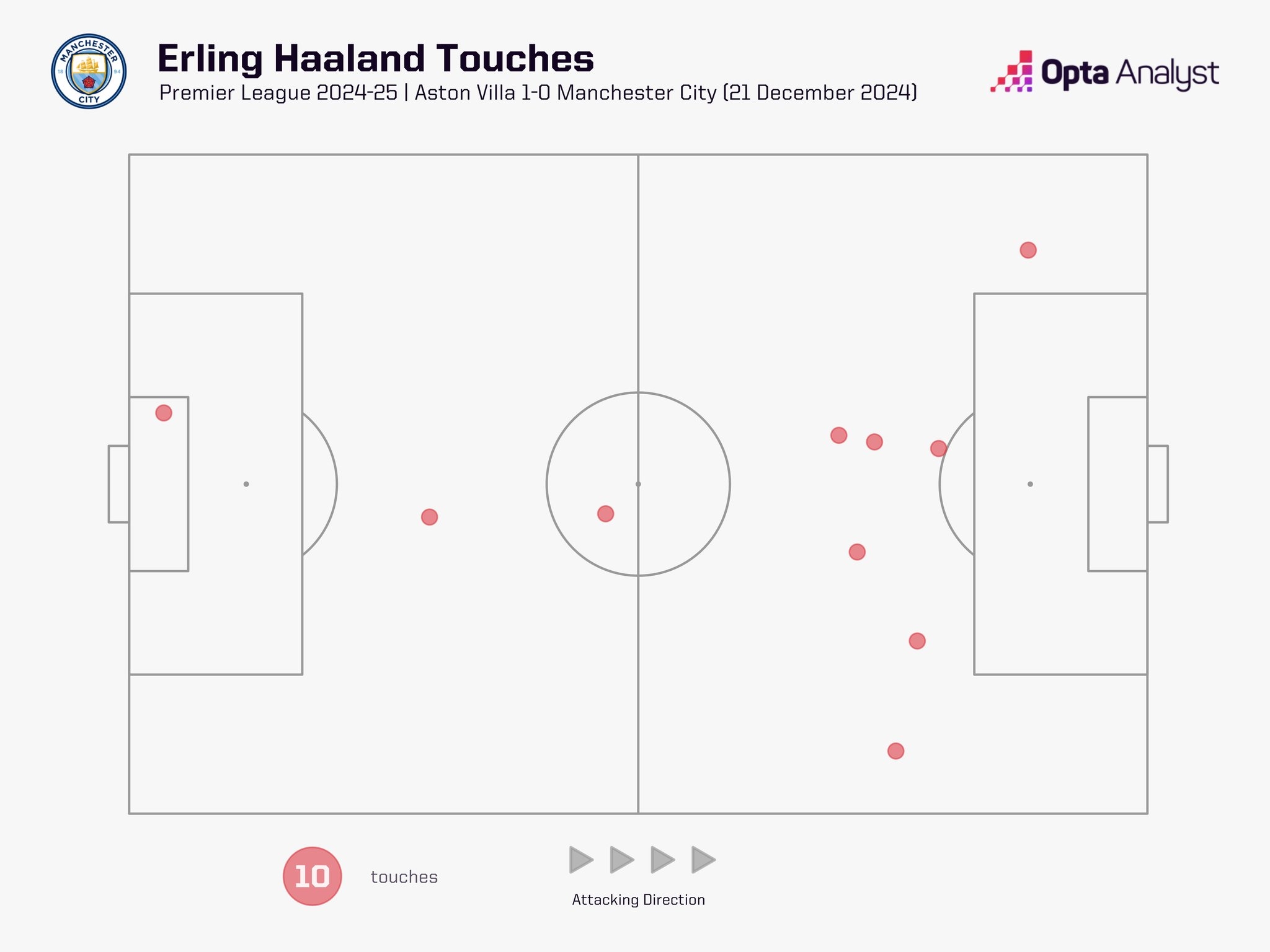 隱身哈蘭德上半場在維拉禁區(qū)觸球0次,本方禁區(qū)觸球1次