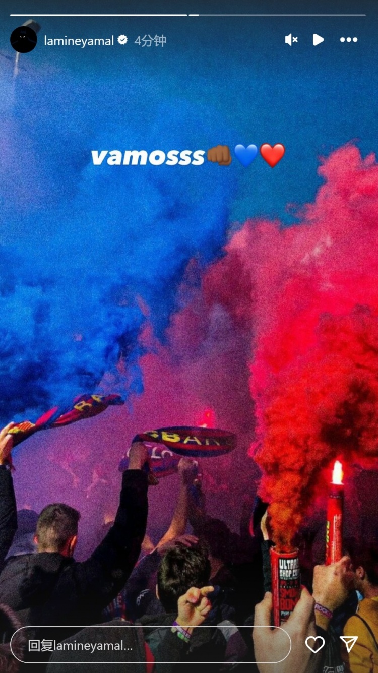 巴薩公布了此役的球員名單,亞馬爾因傷缺席,他在社交媒體上曬出巴薩球迷點(diǎn)燃紅藍(lán)煙霧的照片,配文:“加油!”