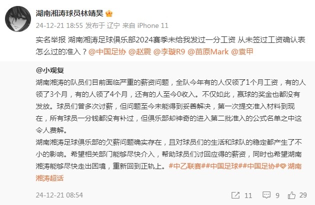 這個(gè)賬號(hào)以“湖南湘濤球員林靖昊”命名,他表示:“實(shí)名舉報(bào),湖南湘濤足球俱樂(lè)部2024賽季未給我發(fā)過(guò)一分工資,從未簽過(guò)工資確認(rèn)表,怎么過(guò)的準(zhǔn)入?”