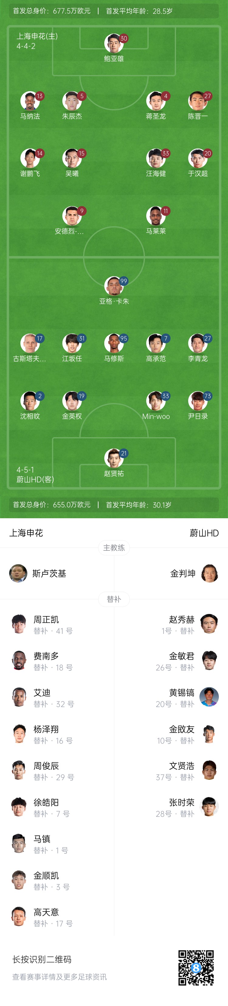 上海申花首發(fā):30-鮑亞雄、4-蔣圣龍、5-朱辰杰、27-陳晉一(F)、13-馬納法(F)、33-汪海健、15-吳曦、14-謝鵬飛、20-于漢超、11-馬萊萊(F)、9-路易斯(F)