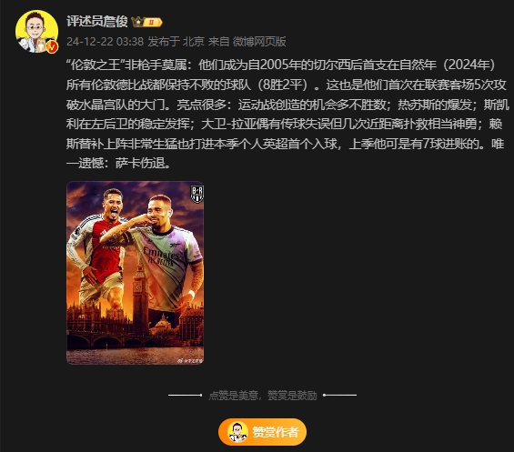 12月22日訊 本輪英超,阿森納5-1戰(zhàn)勝水晶宮,賽后,評述員詹俊對比賽做出點評。